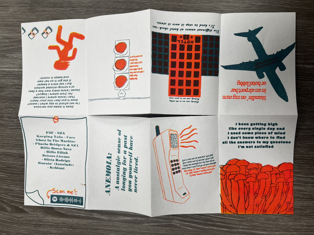 Mix tape zine with the theme "anemoia." Each page is inspired by a different song with a track list and Spotify code on the back so you can listen along. Riso printed and each one individually letterpressed.